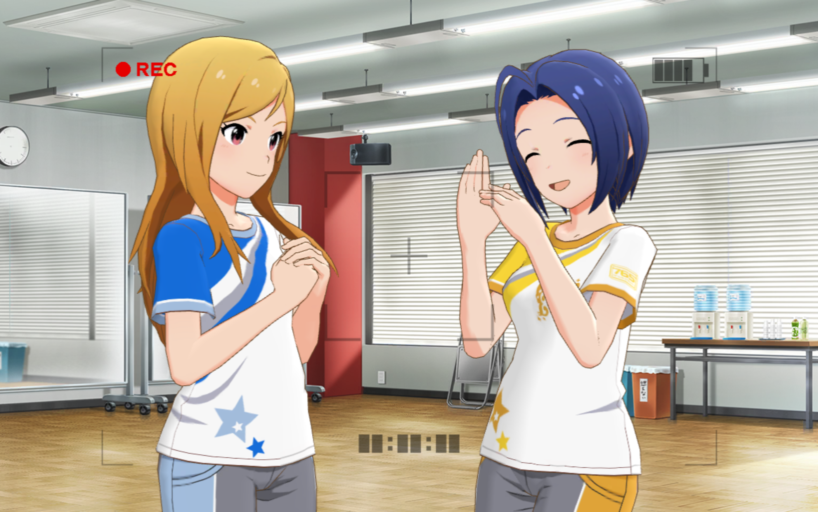 하루카_ 안녕하세요~ ……아, 치하야! 저기, 스탭 분들도. 밀착 취재 수고 많으세요♪